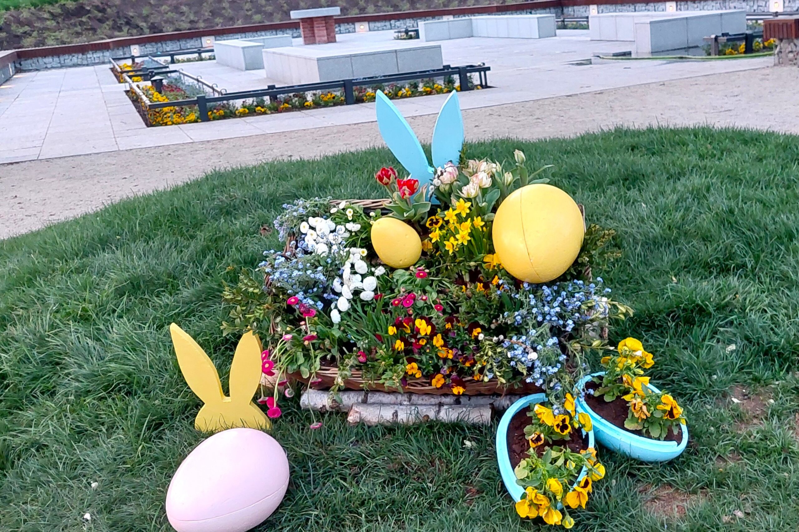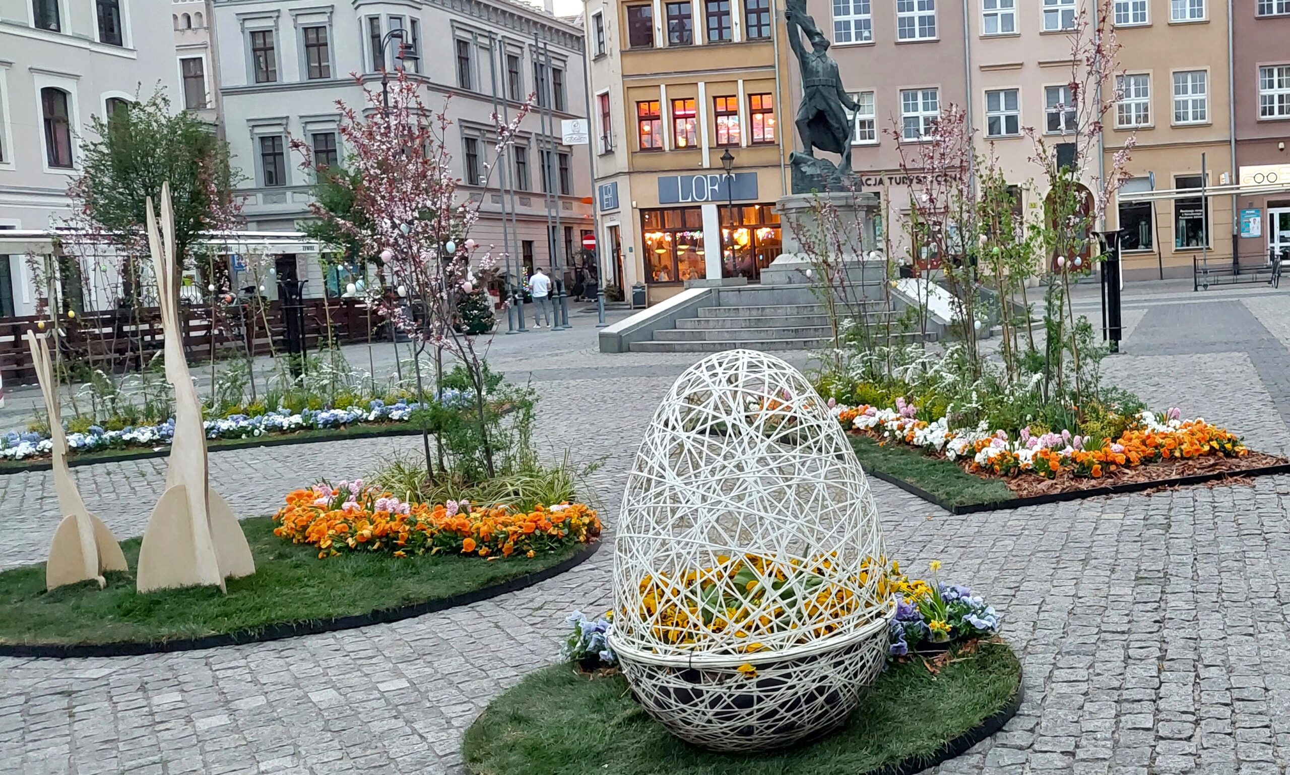 Rynek w Grudziądzu jest świątecznie udekorowany. Drzewka, kwiaty, krzewy, jajka, zające –