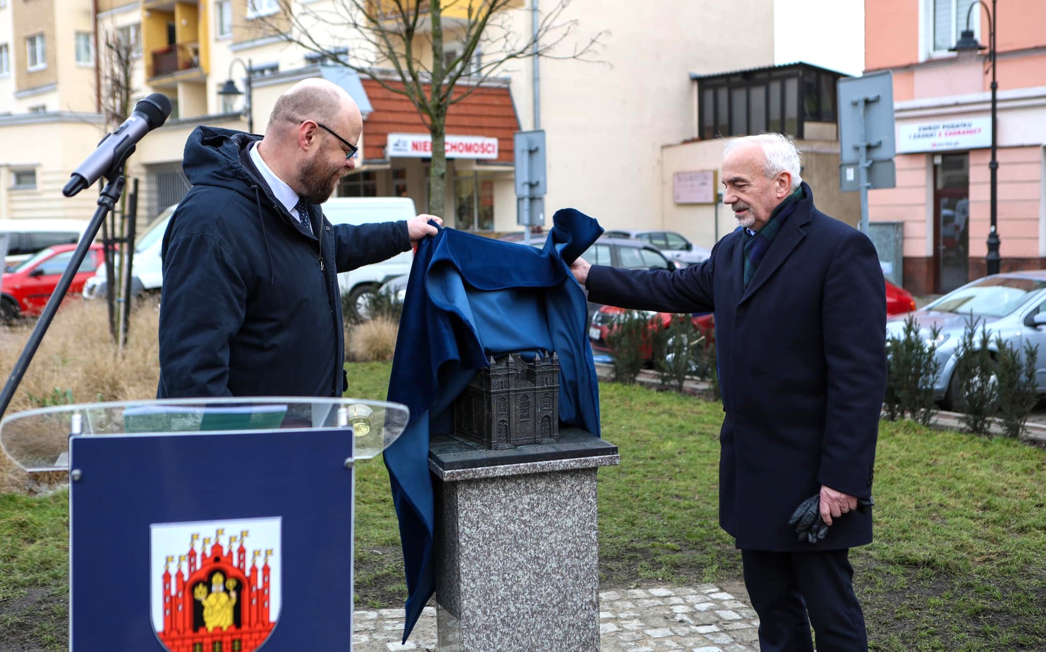 Makietę synagogi, która stała przed laty na pl. Niepodległości, odsłonił dziś w Grudziądzu przewodniczący Rady Miejskiej Szymon Gurbin (zdjęcia)