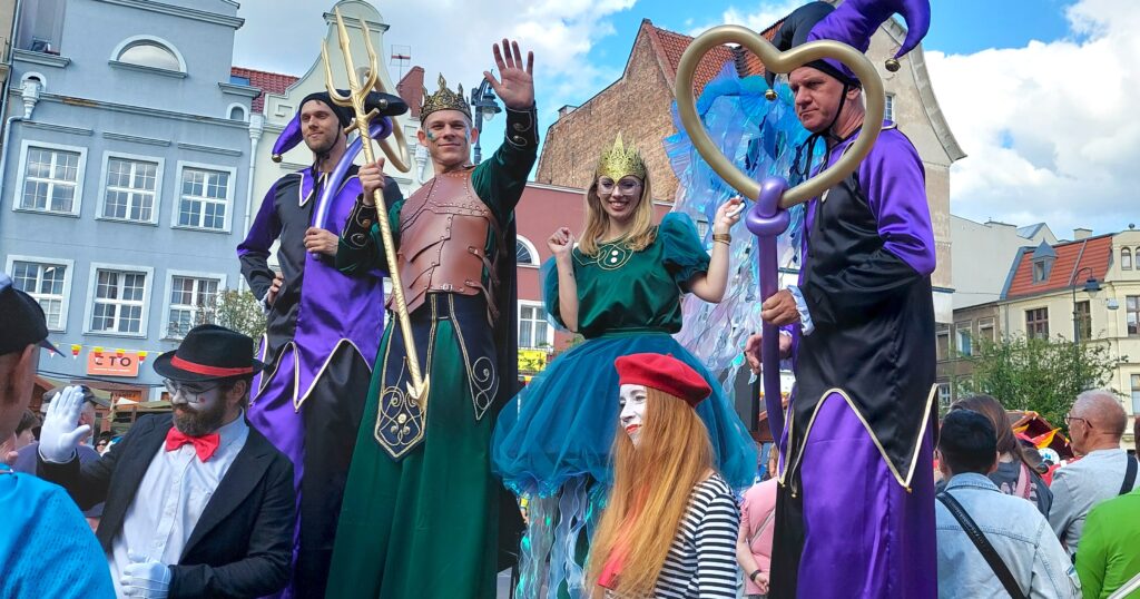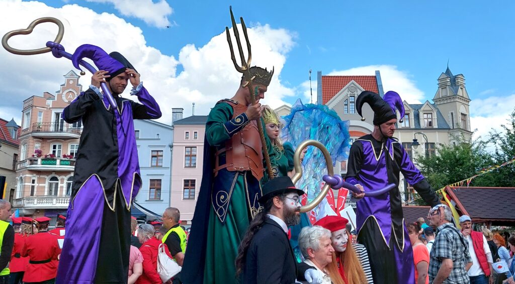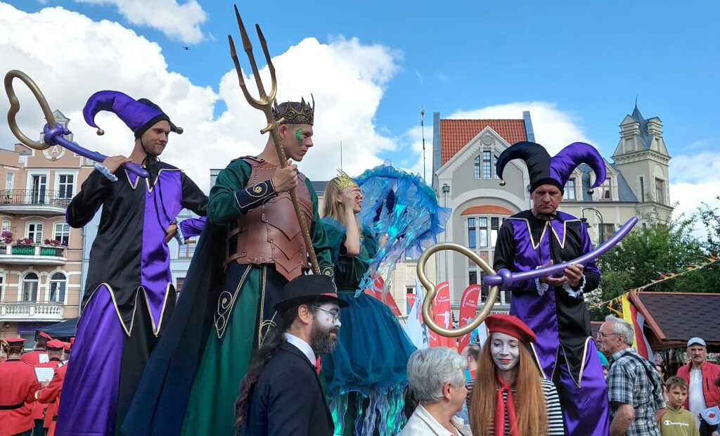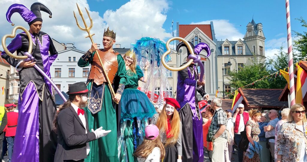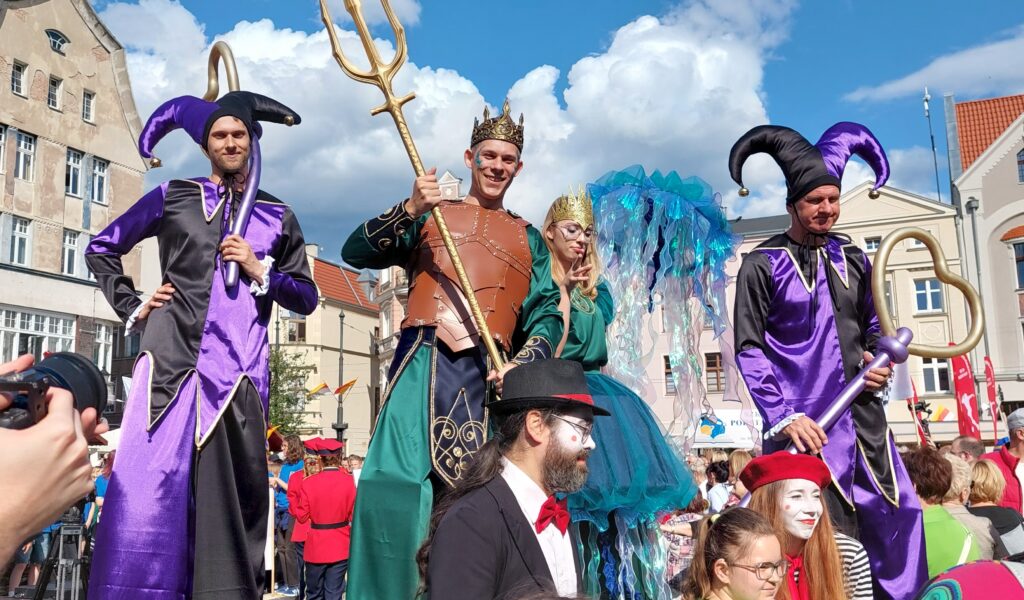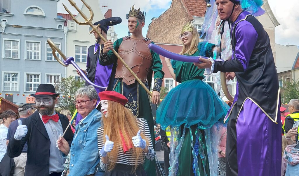 Weseli szczudlarze robili furorę na paradzie i jarmarku na Rynku w Grudziądzu. Głównie Neptun (Posejdon) i królowa mórz. Wiele osób zrobiło sobie z nimi pamiątkowe fotki (zdjęcia)