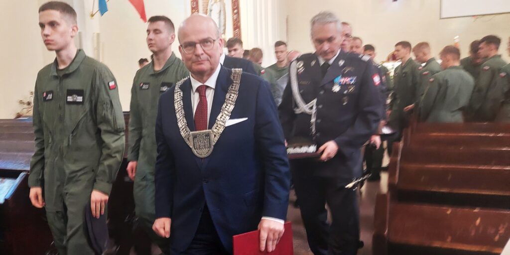 100-lecie Szkoły Orląt rozpoczęła msza św. w Kościele Niepokalanego Serca Najświętszej Marii Panny. Uczestniczyli w niej m.in. gen. brygady pilot dr inż. Krzysztof Cur – rektor Lotniczej Akademii Wojskowej, władze Grudziądza z prezydentem Maciejem Glamowskim i przewodniczącym Rady Miejskiej Szymonem Gurbinem, senator Ryszard Bober, studenci LAW.