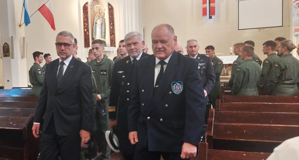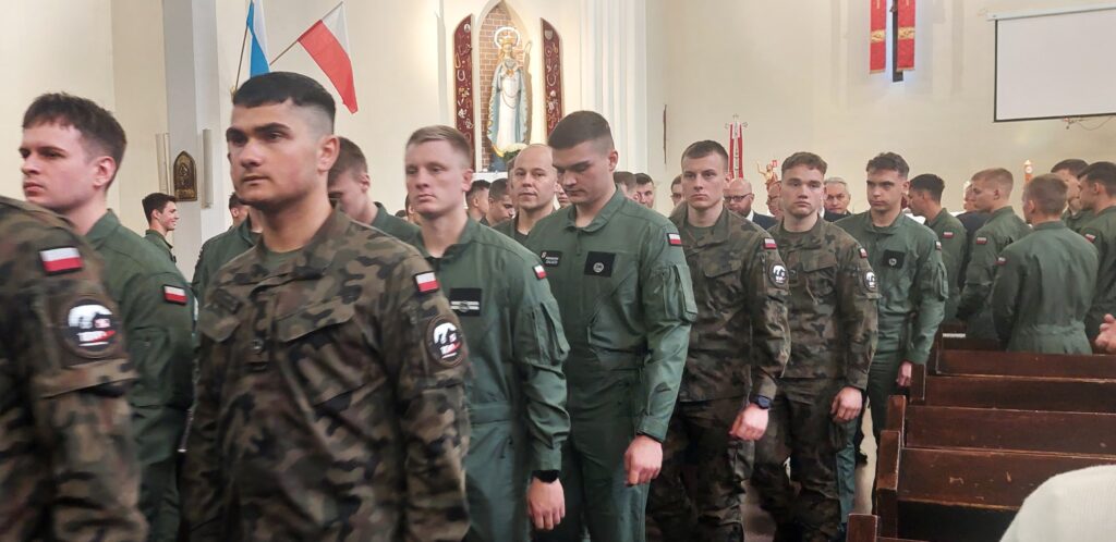 Poczet sztandarowy Lotniczej Akademii Wojskowej na mszy św. w Kościele Niepokalanego Serca NMP (Młodzieżowym) w Grudziądzu.
