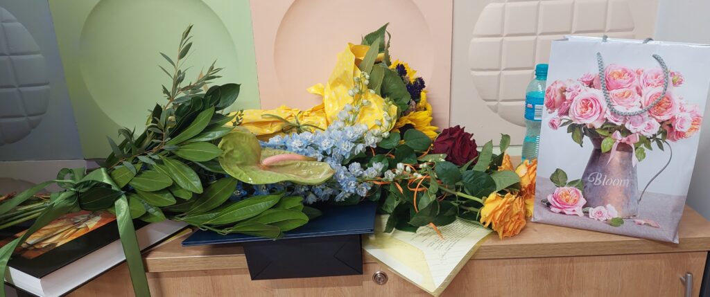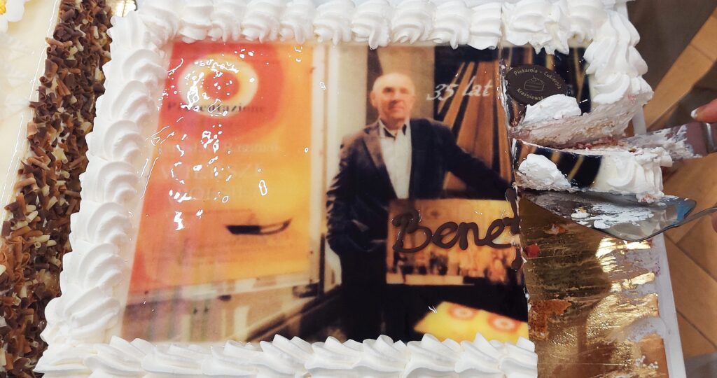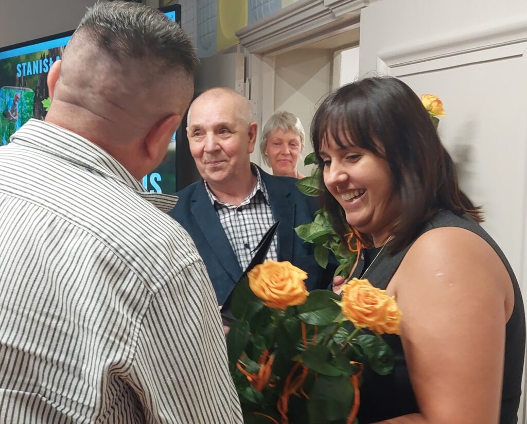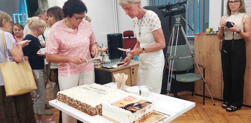 Specjalny prezent przekazała Stanisławowi Raginiakowi medalistka mistrzostw świata i Europy w armwrestlingu – Marlena Wawrzyniak: tort na benefis! Co wspólnego ma ta silna kobieta z literaturą? Otóż pisze wiersze i uczestniczyła przed laty w warsztatach poetyckich prowadzonych przez Stanisława Raginiaka.