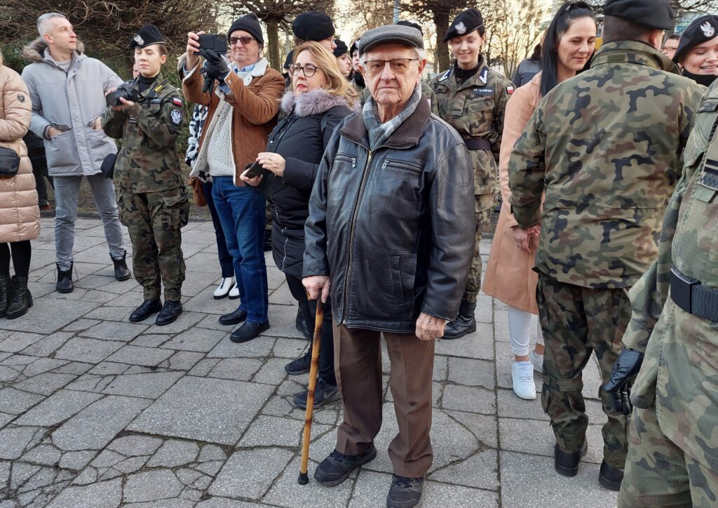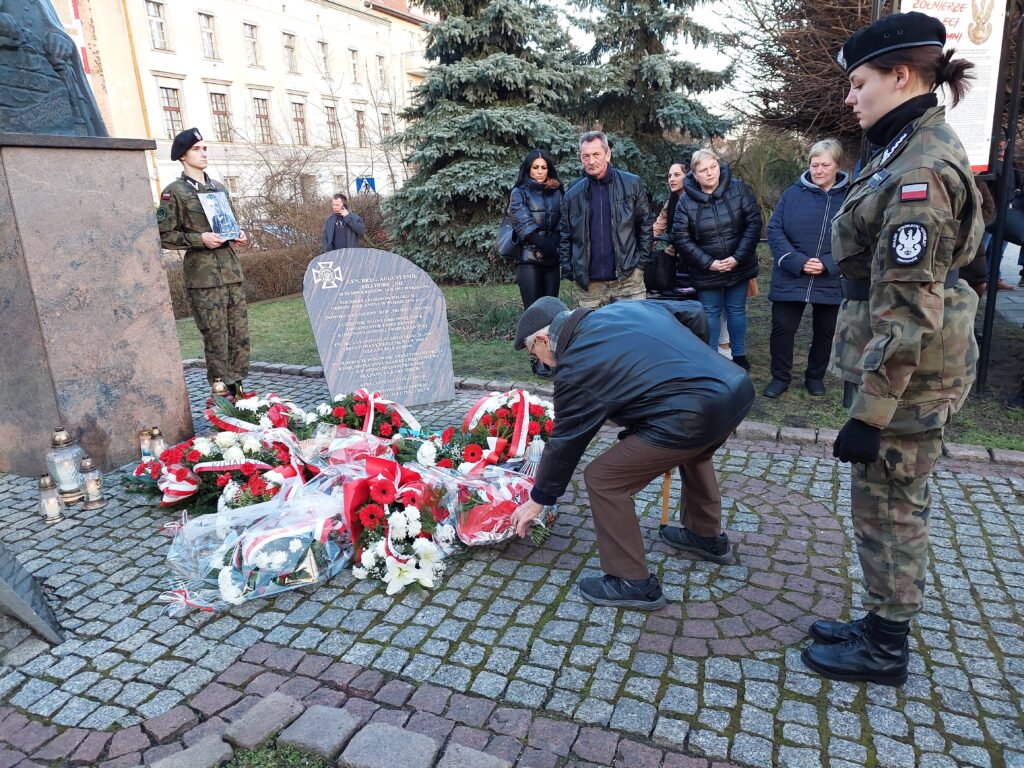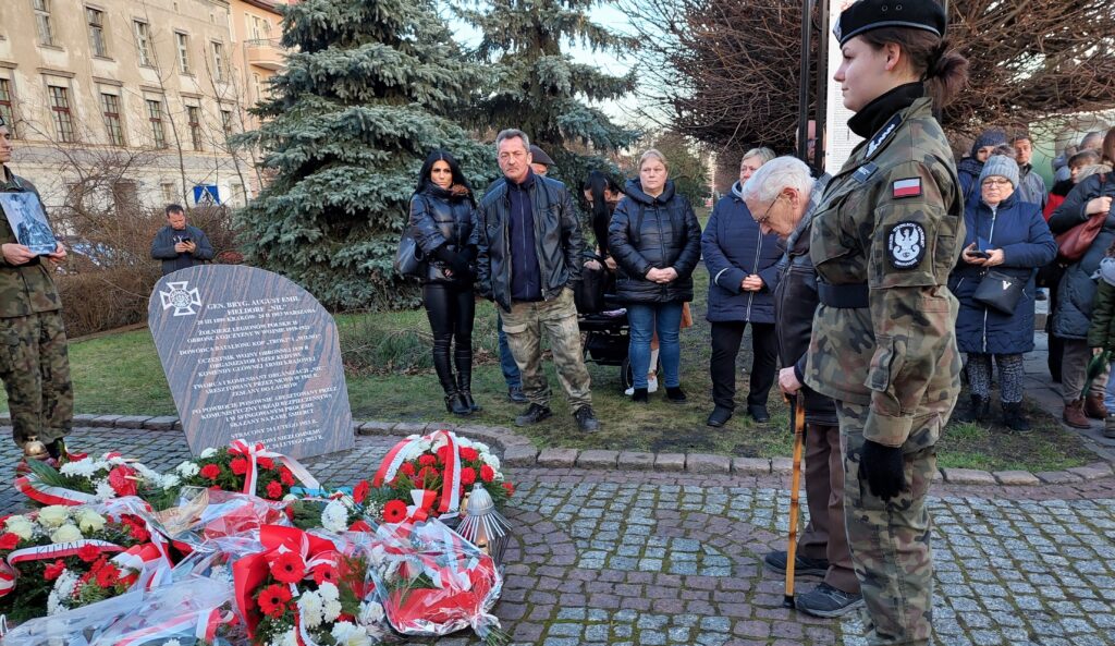 Zbigniew Zelmański w 2023 roku składa kwiaty pod pomnikiem rotmistrza Witolda Pileckiego (al. 23 Stycznia w Grudziądzu).