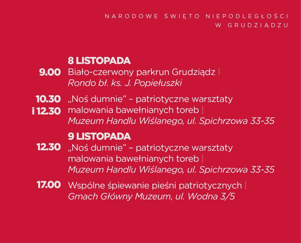 8 i 9 listopada Muzeum Handlu Wiślanego FLIS zaprasza na warsztaty „Noś dumnie”, podczas których uczestnicy poznają ciekawostki o polskich symbolach narodowych i wykonają własnoręcznie bawełniane torby w barwach ojczystych. Zajęcia są przeznaczone dla dzieci od 6. roku życia (zapisy pod numerem tel. 56 46 590 63 wew. 62).