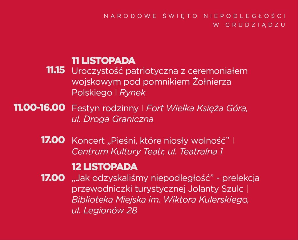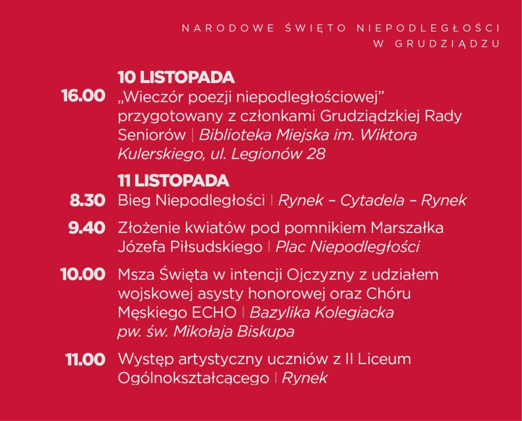 16.00 -„Wieczór poezji niepodległościowej” z Grudziądzką Radą Seniorów – Biblioteka Miejska, ul. Legionów 28