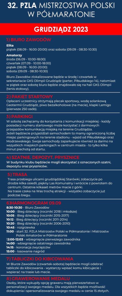 9 września biuro zawodów czynne będzie od godz. 8.30. Start i meta – na stadionie Olimpii przy ul. Piłsudskiego. Przed głównym biegiem mistrzostw Polski odbędą się biegi dla dzieci (około 250 uczestników).
