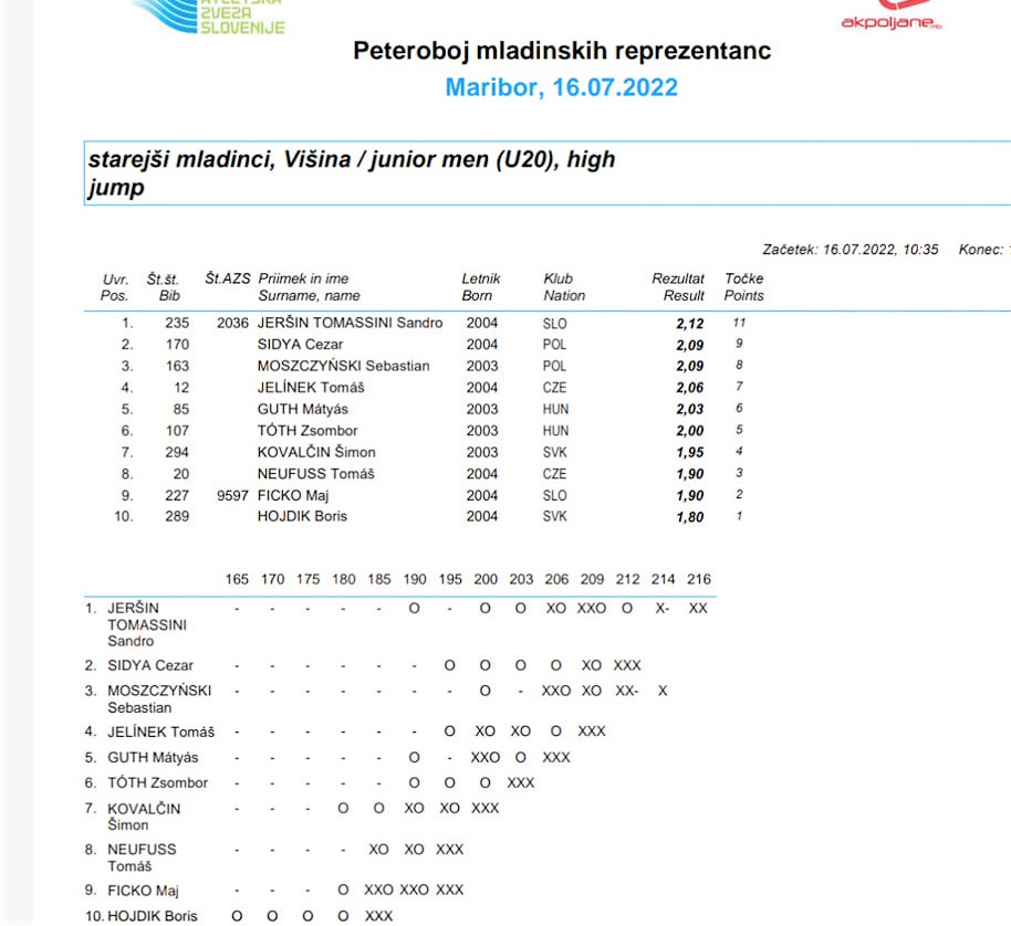 Udany występ zanotował 16 lipca w Mariborze Cezar Sidya, zawodnik GKS Olimpia Grudziądz. Zajął 2. miejsce z wynikiem 209 cm. Konkurs skoku wzwyż wygrał Słoweniec Sandro Jersin Tomassini z wynikiem 212 cm. Na 3. miejscu uplasował się też Polak – Sebastian Moszczyński z rezultatem 209 cm (miał więcej zrzutek niż Sidya).