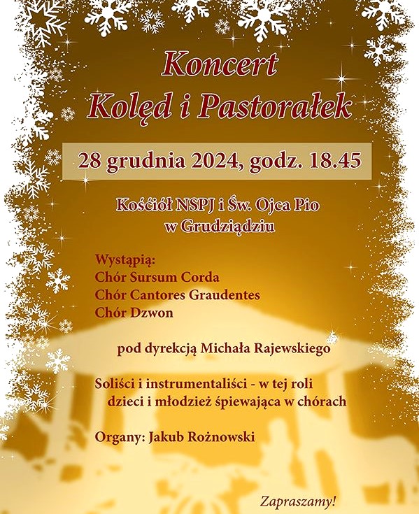 Koncert kolęd i pastorałek już 28 grudnia (sobota) w kościele NSPJ i św. Ojca Pio (Tarpno). Wystąpią chóry: Sursum Corda, Dzwon i Cantores Graudentes. Wstęp wolny (wideo)