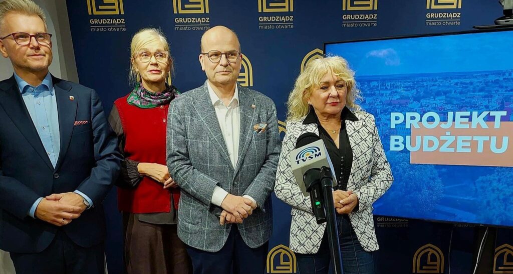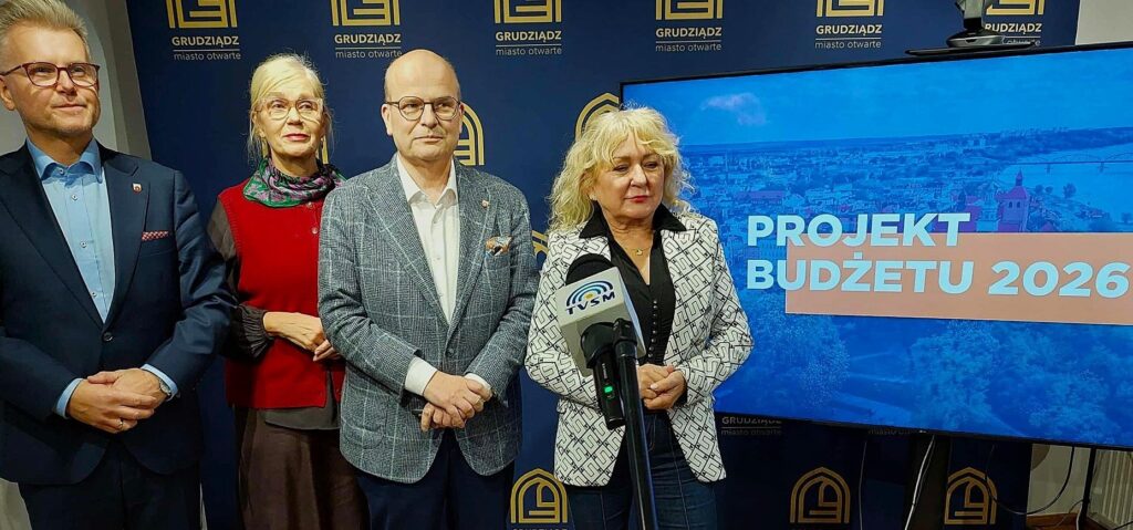 Dziś przedstawiono projekt budżetu Grudziądza na 2026 rok. Oprócz prezydenta Macieja Glamowskiego w konferencji prasowej w Ratuszu uczestniczyli wiceprezydenci: Tomasz Smolarek i Róża Lewandowska oraz Lilianna Kowalska, dyrektor wydziału finansowego.